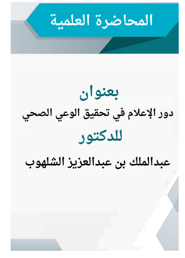 دور الإعلام في تحقيق الوعي الصحي للدكتور عبدالملك بن عبدالعزيز الشلهوب الاسثمار بالموارد البشرية للدكتور عبدالله بن عبدالعزيز آل الشيخ محاضرة تقنية المعلومات للدكتور صلاح محمد رحال محاضرة الطب البديل للدكتور عبدالقادر الضعيف محاضرة مهارات الاتصال للدكتور علي أحمد مصطفى محاضرة البحث العلمي للدكتور عبدالرحمن بن عبدالعزيز آل الشيخ